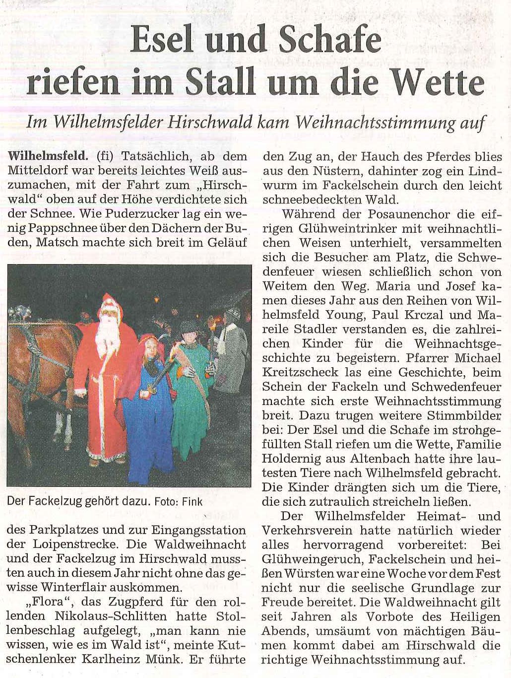 Der Heimat- und Verkehrsverein e.V. 1952 Wilhelmsfeld bedankt sich recht herzlich bei Pfarrer KREITZSCHEK, bei WILHELMSFELD YOUNG für die Darstellung von Maria und Josef, bei KARLHEINZ MÜND für den Pferdeschlitten, bei MIRCO HELFRICH dem Nikolaus, sowie der Familie HOLDERNIG für die Esel und Schafe und dem EVANGELISCHEN POSAUNENCHOR für die Weihnachtslieder.